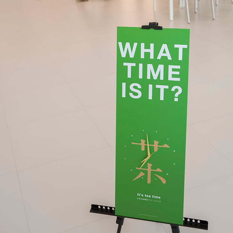 「茶」の文字の一部を時計の針に担ってもらいました。文字盤をずらしているので、3:00になると、「茶」の文字が完成します。