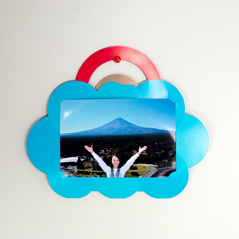 富士急ハイランドリゾートホテル屋上に設置された、フジヤマスカイバルコニー。そこでの記念写真を入れて持ち帰るためのパッケージのデザイン。フジヤマスカイバルコニーから富士山が見えるか見ないかは雲次第。そんな雲をモチーフにデザインをスタートさせました。全体を金の雲で表現。持ち手は虹にストッパー部分は雲間から顔を出した富士山になっています。内側は空のブルー。そのまま壁に掛けて飾ることができます。「写真を持ち帰ること」と「写真を飾ること」の二つの役割を1枚の紙で製作することを試みてこの形状となりました。