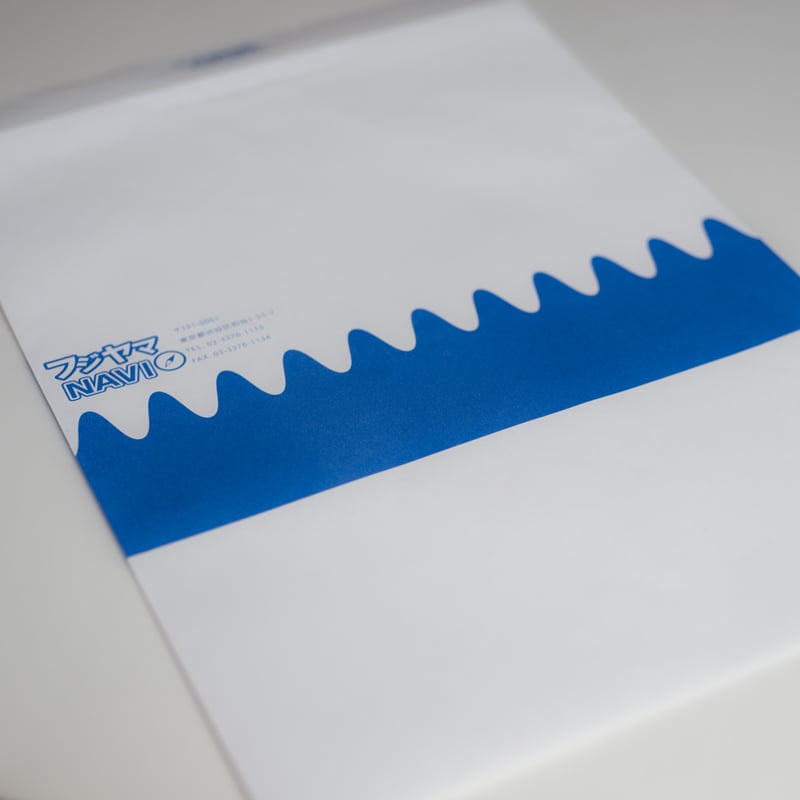 青と白の境界線を波線で描いたシンプルなデザイン。それをメモパッドと封筒にしました。