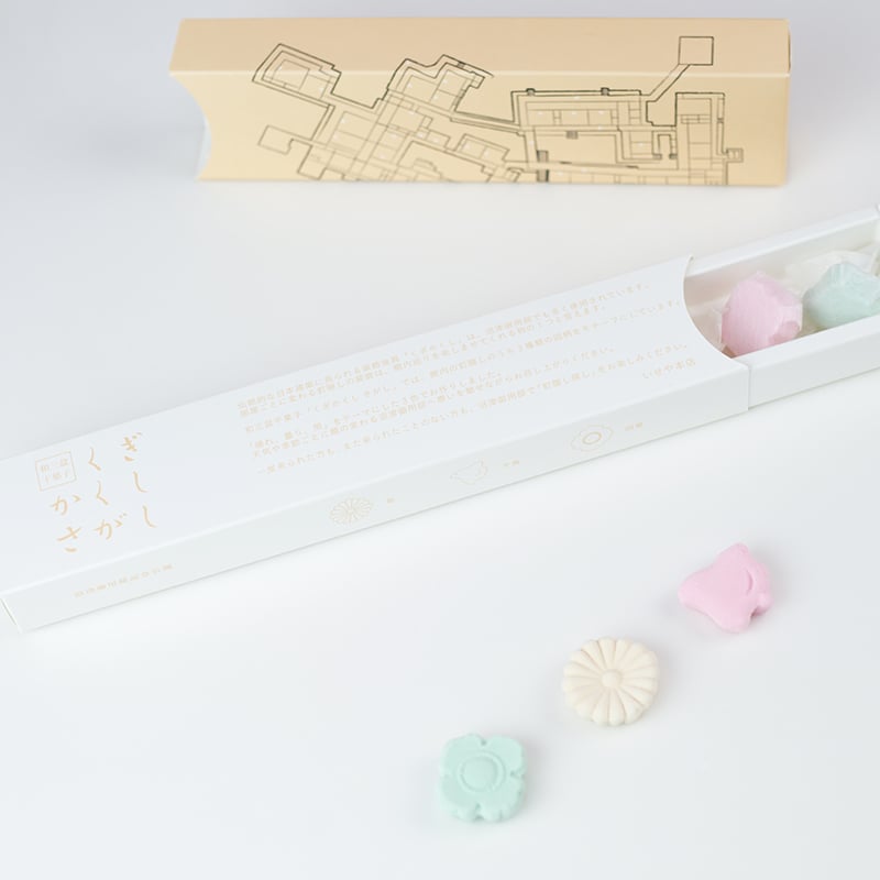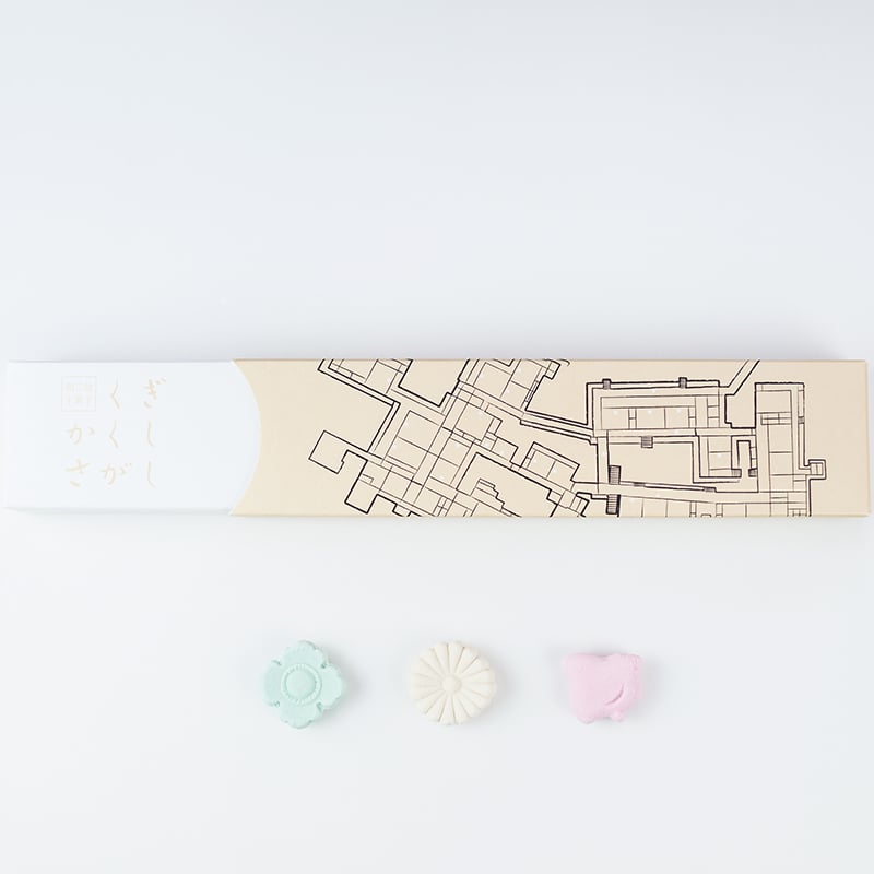 伝統的な日本建築に見られる装飾金具「くぎかくし」は、「沼津御用邸」でも多く使用されています。部屋ごとに変わる釘隠しの装飾は、館内巡りを楽しませてくれる物の1つと言えます。館内の釘隠しをモチーフに3種類の和三盆をご用意しました。それぞれ、「晴れ、曇り、雨」をテーマにした3色でお作りしています。天気や季節ごとに趣の変わる沼津御用邸へ想いを馳せながらお召し上がりください。一度来られた方も、まだ来られたことのない方も、釘隠しの地図を片手に沼津御用邸で「釘隠し探し」をお楽しみください。