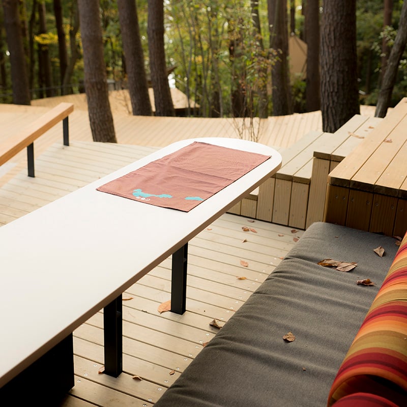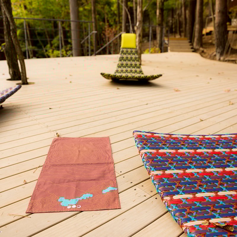そんなフレキシブルな機能性を隠し持つ「切り株」をモチーフとして長方形のコットンをご用意しました。広げて座ったり、よみかけの本を置いたりすることができます。